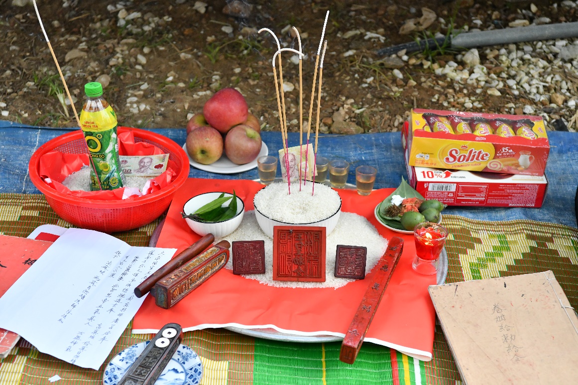 Phần mở đầu của buổi lễ là nghi thức “khai quang” được thực hiện ngoài trời – thầy Hòa khấn mời Ngọc Hoàng, các vị thần bản mệnh, tổ tiên nghề thầy cúng về chứng giám. Lời khấn được vang lên, âm điệu ngân nga, nhịp nhàng như một bản nhạc linh thiêng. Sau đó là nghi thức “rước sắc” - tờ sắc lệnh (tượng trưng bằng giấy hoặc vải đỏ) được đặt trang trọng trên bàn thờ, sau đó trao cho người được cấp sắc. Đây là khoảnh khắc thiêng liêng nhất của buổi lễ, đánh dấu việc người đó chính thức được các đấng thần linh và tổ nghề công nhận là thầy cúng thực thụ.