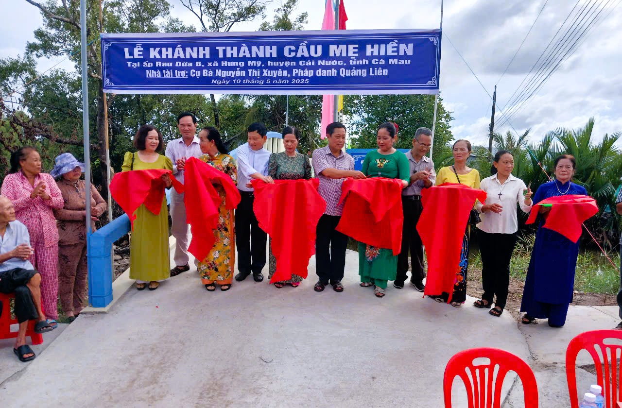 Linh mục Martinô Nguyễn Hoàng Hôn, Phó Chủ tịch UBĐKCG tỉnh Cà Mau (đại biểu thứ 2 từ trái sang) tham dự và cắt băng khánh thành cầu giao thông nông thôn tại xã Hưng Mỹ, huyện Cái Nước (cũ), ngày 10/5/2025