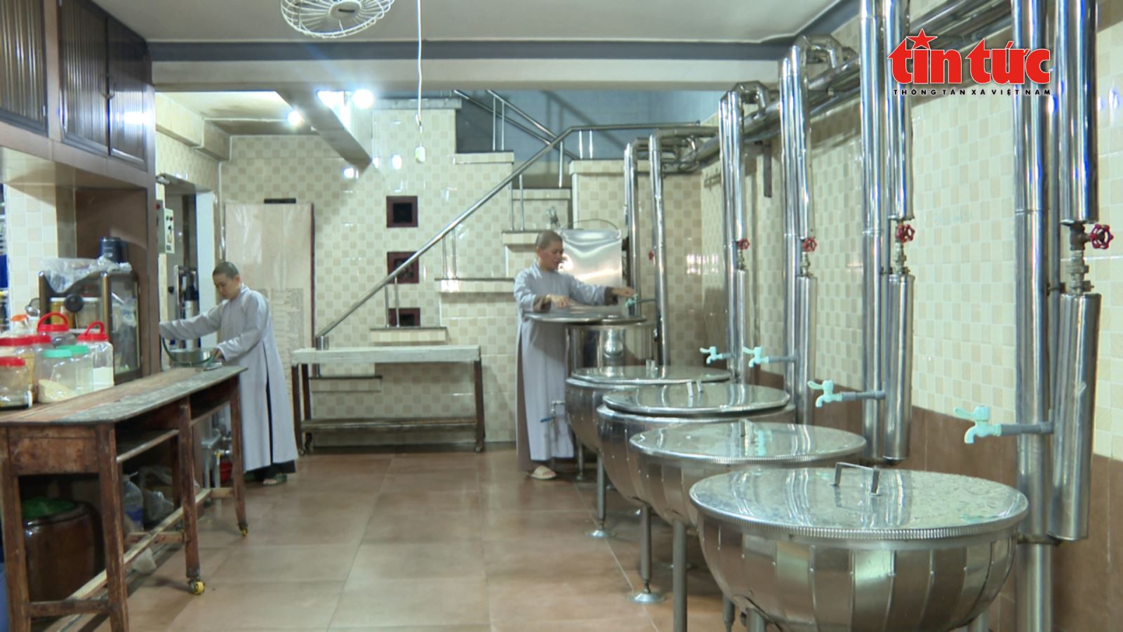 Để giải quyết bài toán đun nấu lớn, Tổ đình Kim Sơn đã triển khai một giải pháp sử dụng hệ thống nấu bằng hơi nước nóng. Ni sư Thích Nữ Lệ Thuận, Trụ trì Tổ đình Kim Sơn cho biết, hệ thống này mang lại sự an toàn và tiện lợi vượt trội: “Phần dưới chúng tôi đun bằng củi nhỏ, còn ở trên hoàn toàn là hơi nước nóng. Nước được cung cấp tự động, có đồng hồ đo nhiệt, khi sôi sẽ dẫn theo ống tới các nồi nấu, hoàn toàn không có lửa trực tiếp nên an toàn hơn rất nhiều. Củi cũng chỉ cần ít, lại có chuông báo khi nhiệt độ cao nên tôi rất an tâm”.