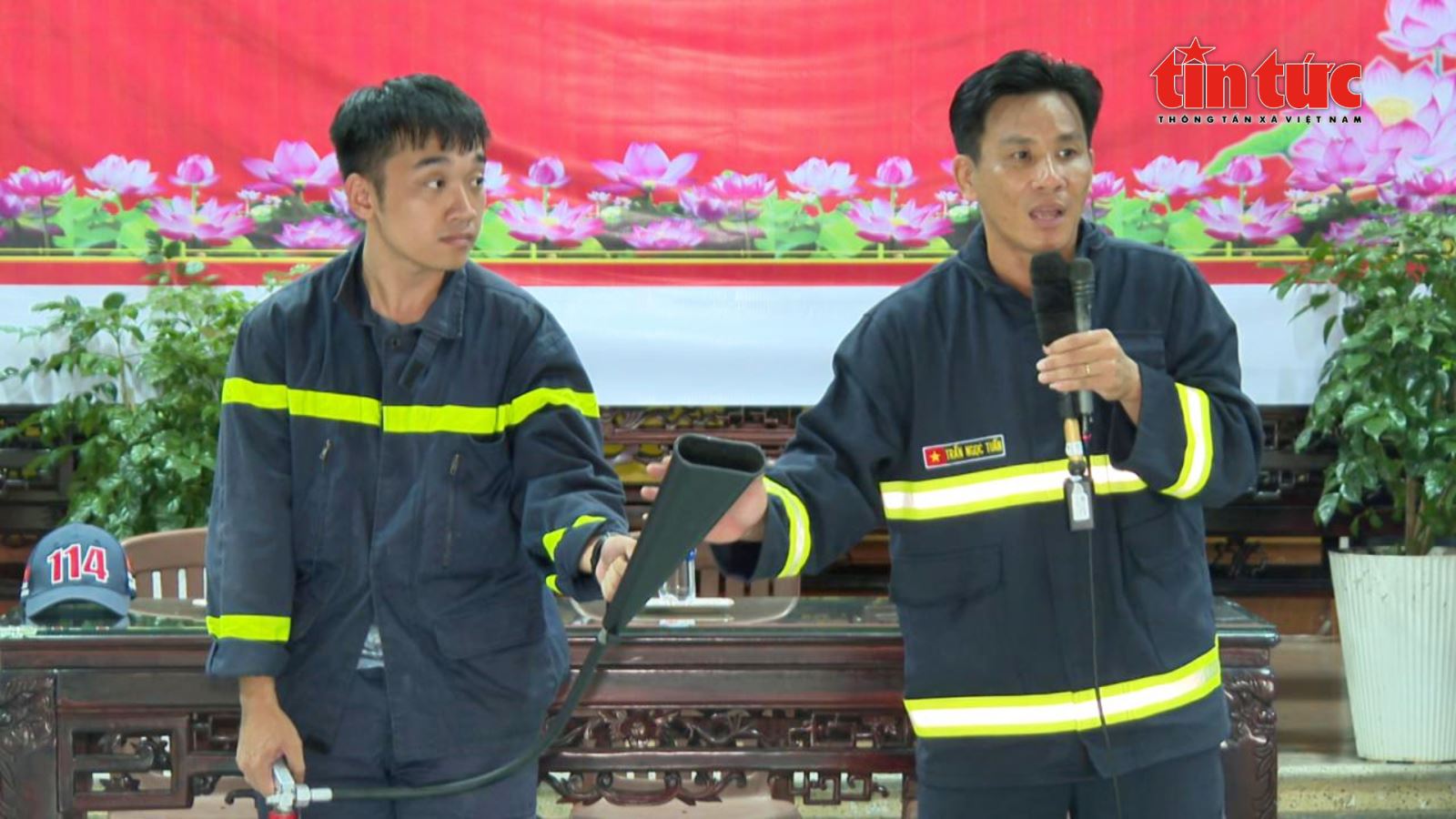 Trong buổi tập huấn mới đây, các chiến sĩ cảnh sát đã hướng dẫn tỉ mỉ từ cách nhận biết các loại bình chữa cháy, cách sử dụng cho đến kỹ năng xử lý tình huống khi có cháy và cách thoát nạn an toàn.