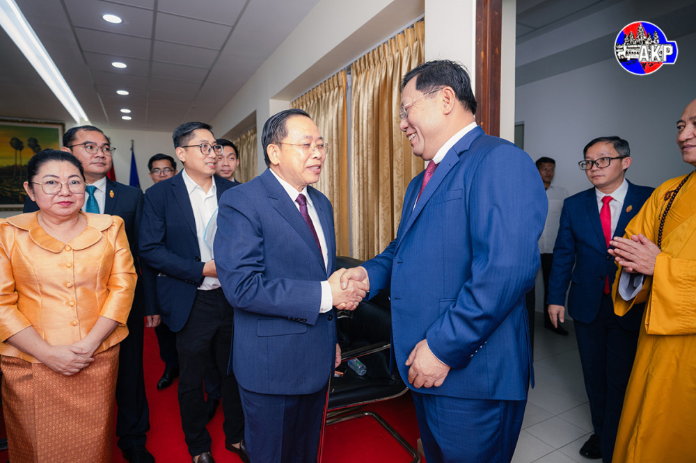 Bộ trưởng Bộ Lễ nghi và Tôn giáo Campuchia Chay Borin chủ trì buổi tiếp Thứ trưởng Bộ Dân tộc và Tôn giáo Việt Nam Nguyễn Hải Trung và đoàn công tác. Ảnh: AKP