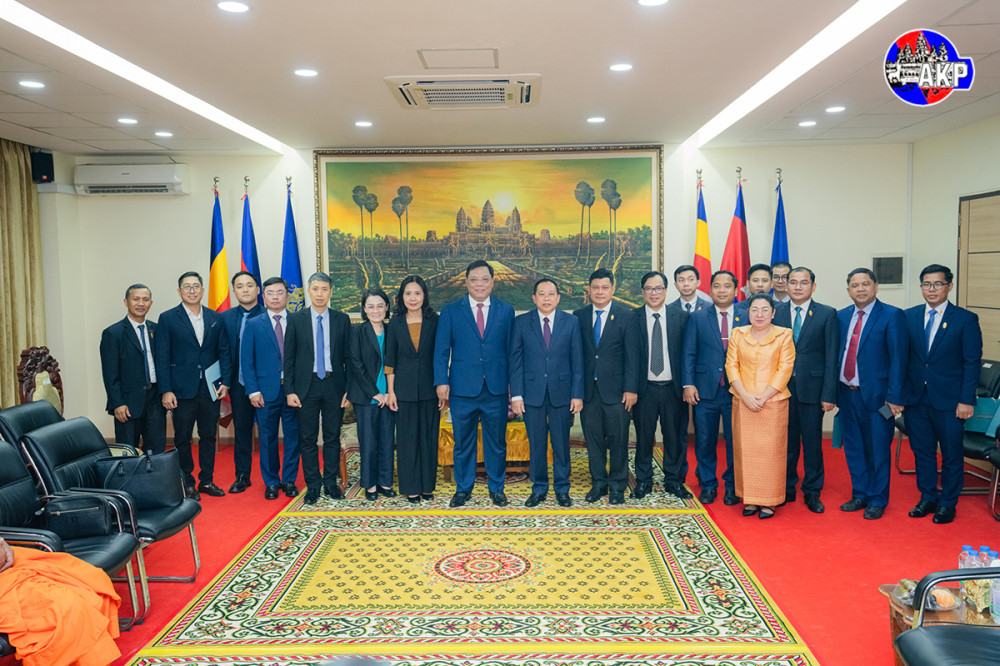 Thứ trưởng Nguyễn Hải Trung và Bộ trưởng Chay Borin chụp ảnh lưu niệm cùng các thành viên Bộ Dân tộc và Tôn giáo Việt Nam, Bộ Lễ nghi và Tôn giáo Vương quốc Campuchia tham dự buổi tiếp. Ảnh: AKP