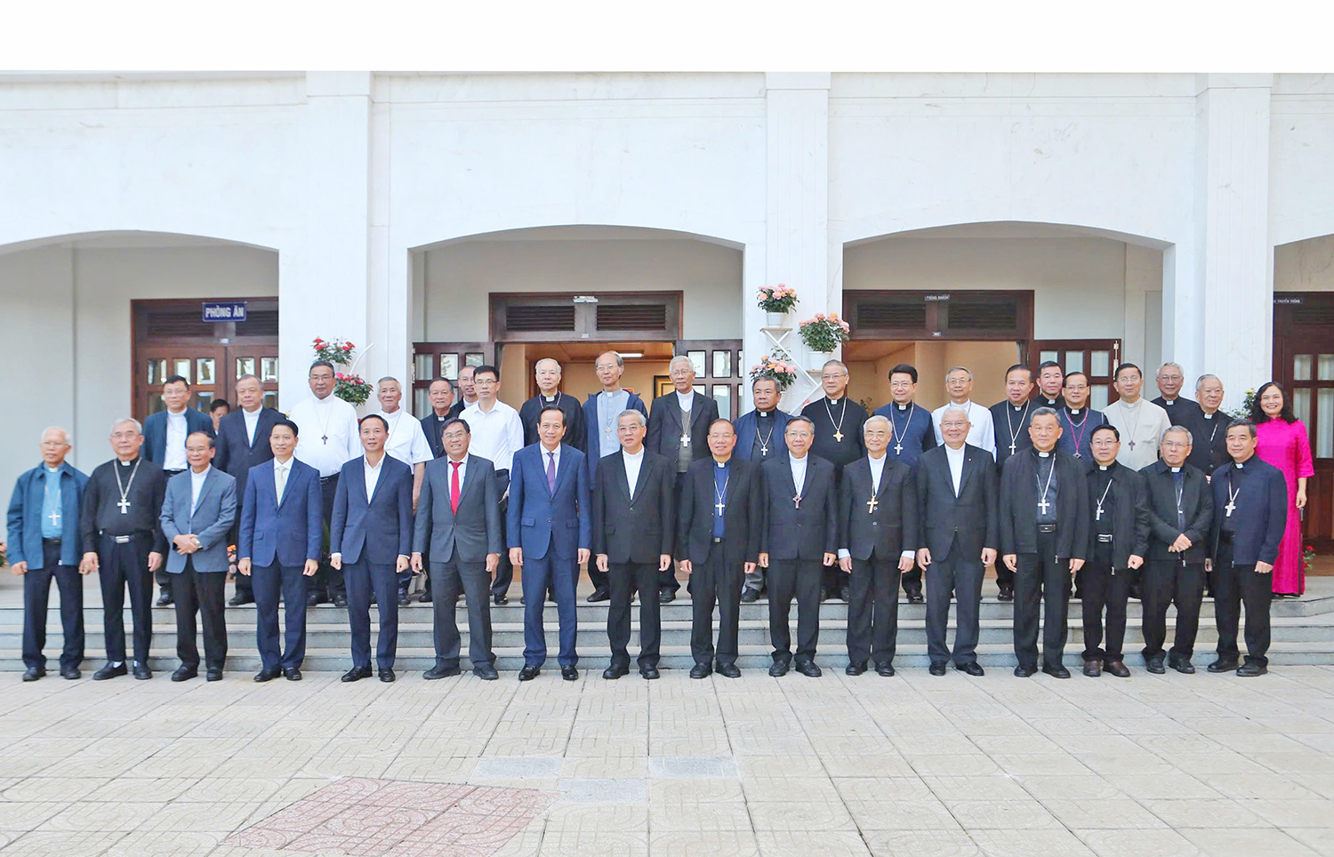 Tiếp đoàn, có Tổng Giám mục Giuse Nguyễn Năng, Chủ tịch Hội đồng Giám mục Việt Nam, Tổng Giám mục Tổng Giáo phận Thành phố Hồ Chí Minh; Tổng Giám mục Giuse Vũ Văn Thiên, Phó Chủ tịch Hội đồng Giám mục Việt Nam, Tổng Giám mục Tổng Giáo phận Hà Nội và các giám mục trong Ban Thường vụ Hội đồng Giám mục Việt Nam nhiệm kỳ 2025-2028; Hồng y Nguyễn Văn Nhơn và 29 giám mục thuộc 27 giáo phận trong cả nước.